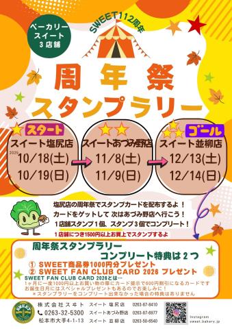 スイート塩尻店の周年祭を皮切りに11月はスイートあづみ野店、12月はスイート並柳店と、周年祭が3か月連続で開催されます。