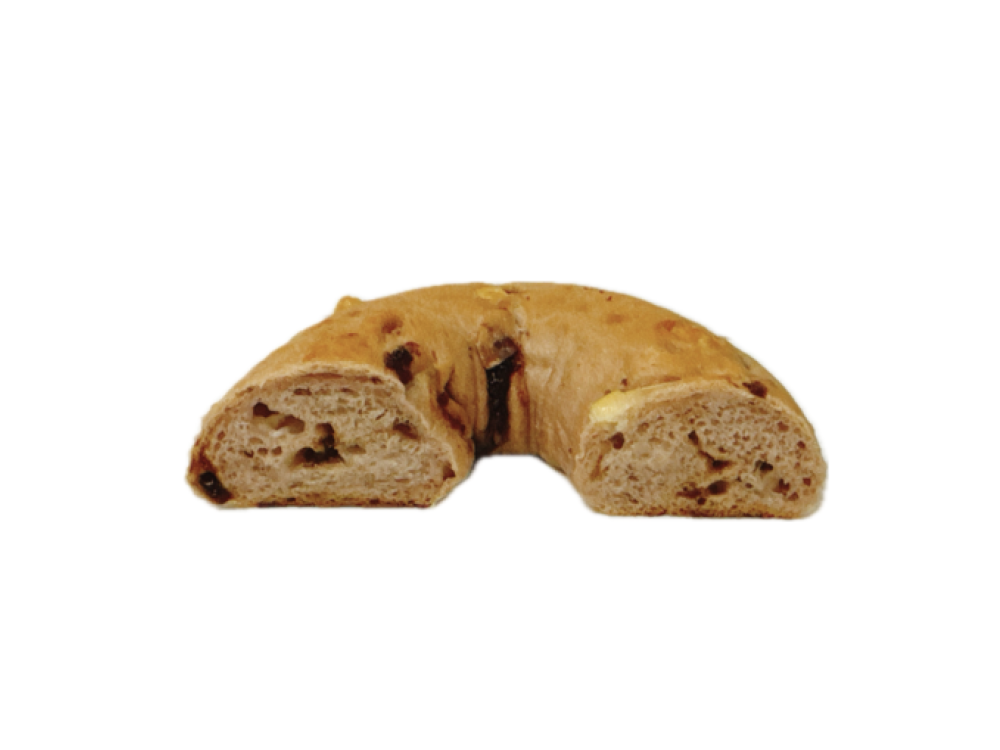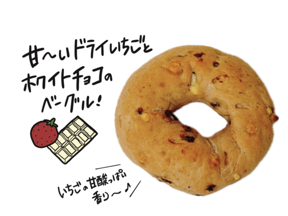 季節にぴったりのいちごとホワイトチョコを使ったベーグルが登場!もちもちの米粉生地に、フルーティな香りが特徴のキルシュに漬けたドライいちご、ホワイトチョコチップを練りこんで、リング状にして焼き上げました。いちごの香りがふんわり漂う、ピンク色をした可愛らしいベーグルです。