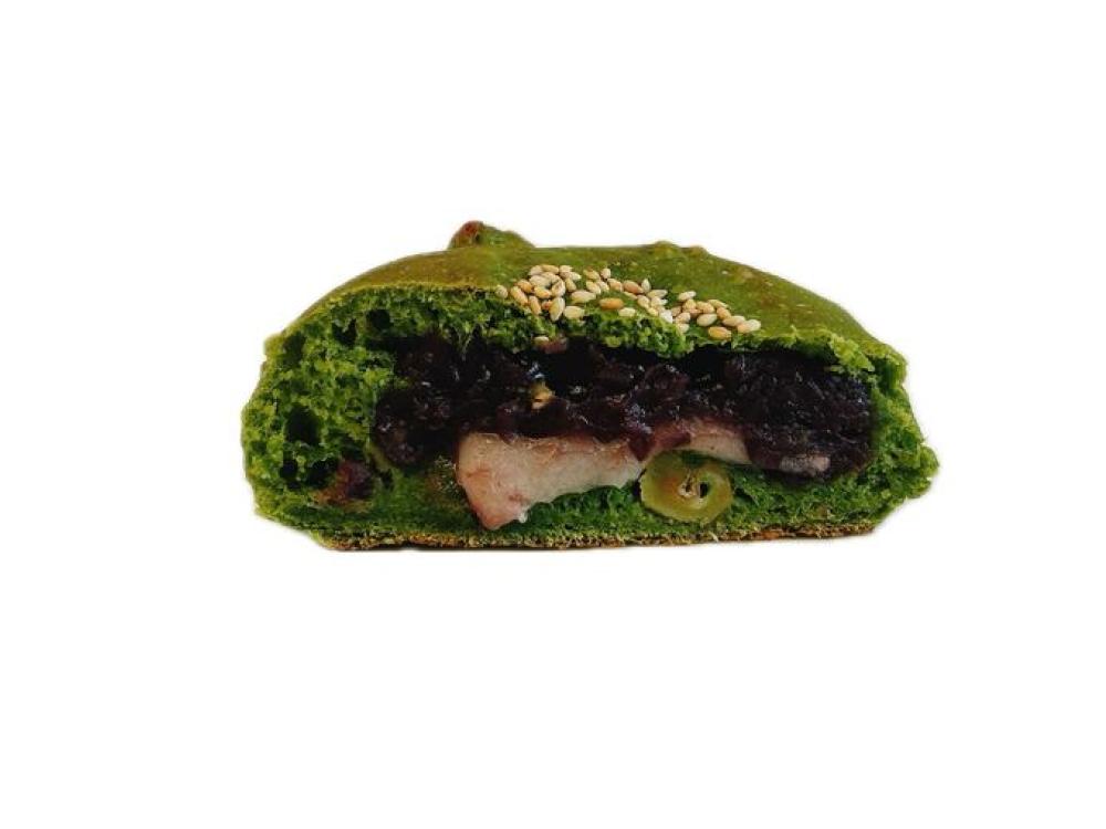 くるみバンズでおなじみのくるみ生地に抹茶を練り込み、お餅と粒あんをたっぷり包み、白ごまをトッピングして焼き上げました。