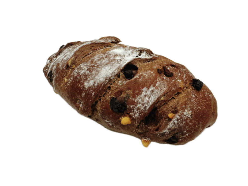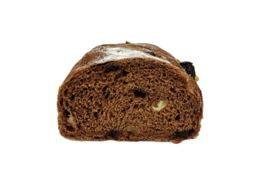 ライ麦が入ったココア生地にチョコチップ、オレンジピール、クルミを練り込んで焼き上げました。