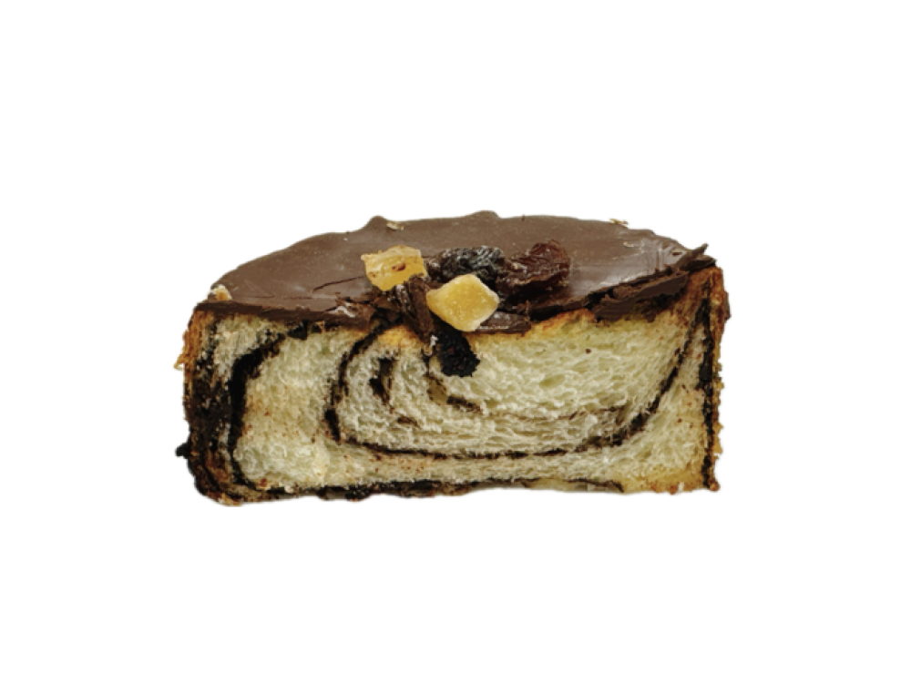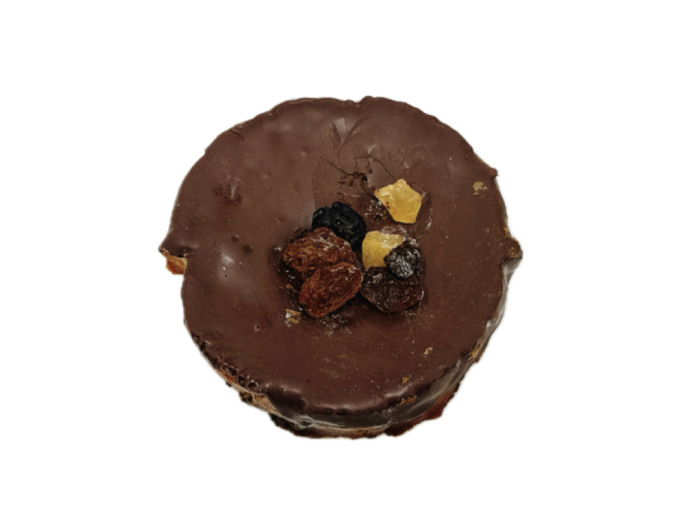 期間限定のショコララウンドをフレンチにし、コーティングチョコにつけて、ドライフルーツを飾り付けました。チョコを混ぜ込んだラウンドパンとチョココーティングのダブルで甘い!まるでケーキのような高級感を演出しました