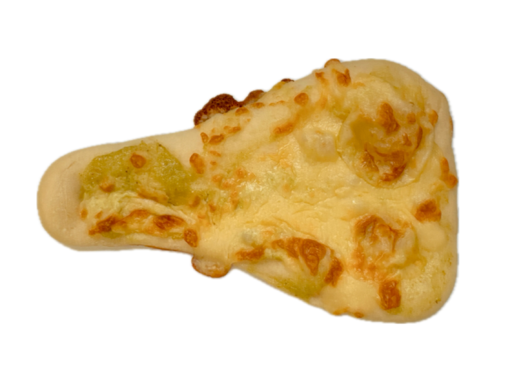 スイートの食パン生地を薄く広げ、あづみ野産のわさびとマヨネーズを混ぜたソースをたっぷり塗り、その上にチーズを振りかけ焼き上げました。わさびの爽やかなツーンとした刺激と濃厚なマヨネーズとチーズがマッチ!