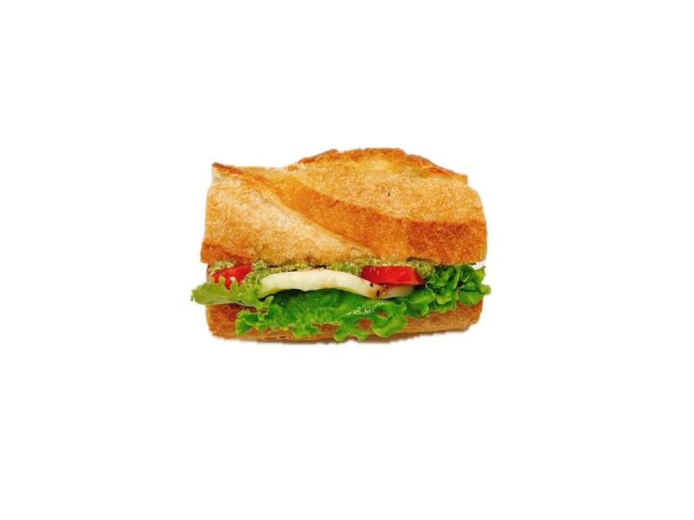 フランスパンのバケットに斜め切り込みし、グリーンリーフ、塩胡椒とオリーブオイルで味付けたモッツァレラチーズ、トマトスライスをはさみ、バジルソースをトッピング!!