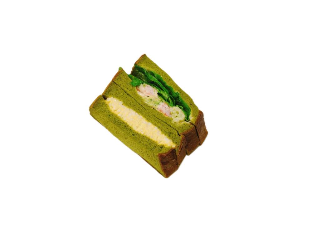 ほうれん草食パンに『タマゴサラダ』をサンドしたものと『レタス・エビとブロッコリーのサラダ』をサンドしたもの 2 種類をセットに。エビ・ブロッコリー・ほうれん草食パン・卵の赤緑黄色で春らしい彩りのサンドイッチ。
