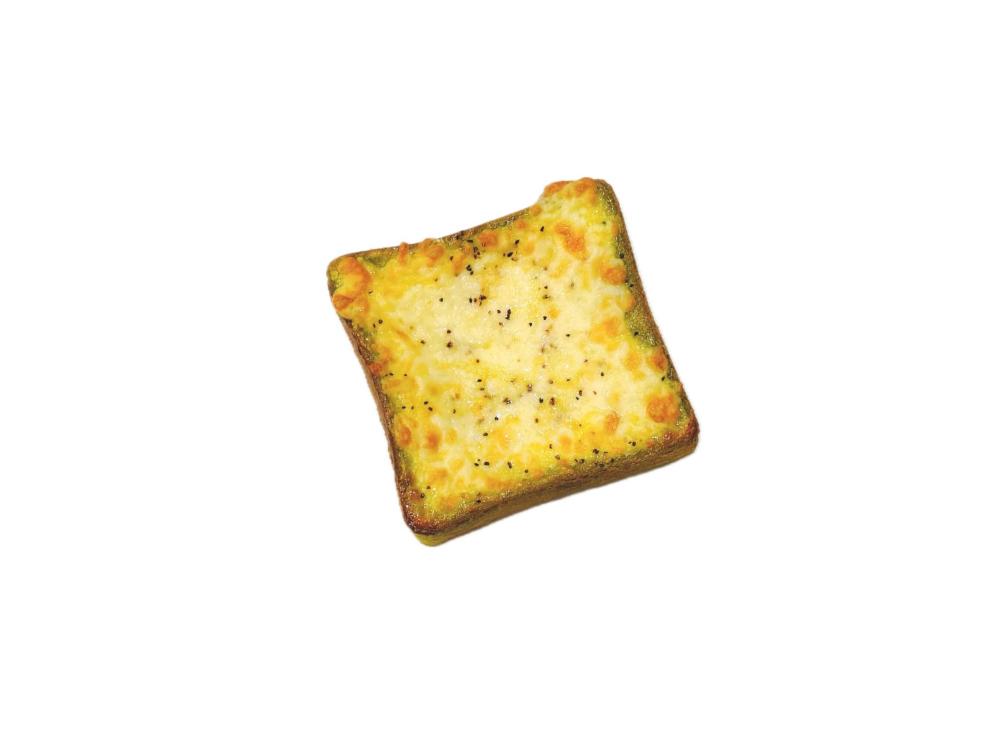 ほうれん草食パンにスパイシーチーズを塗り、シュレッドチーズ・ブラックペッパーをかけてこんがり焼き上げました。